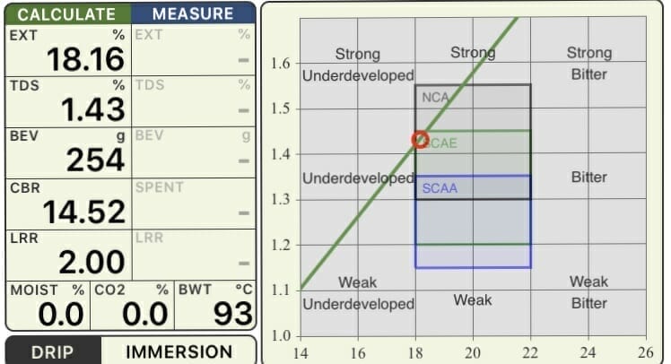 We decided to design the next recipe to have a higher soluble concentration (to increase the body and intensity) and a slightly lower extraction percentage (to remove the touch of bitterness and make that yummy acidity pop a tad more. We did this by tightening up the ratio a tad to 1:15 (to increase the intensity) and coarsening the grind a tiny tiny bit to decrease the extraction.